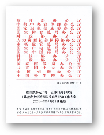 2021年4月,教育部等15個(gè)全國綜合防控兒童青少年近視工作聯(lián)席會(huì)議機(jī)制成員單位聯(lián)合印發(fā)《兒童青少年近視防控光明行動(dòng)工作方案(2021—2025年)》