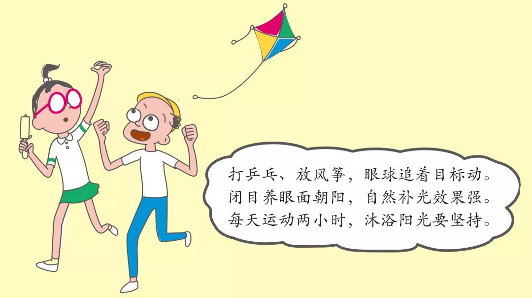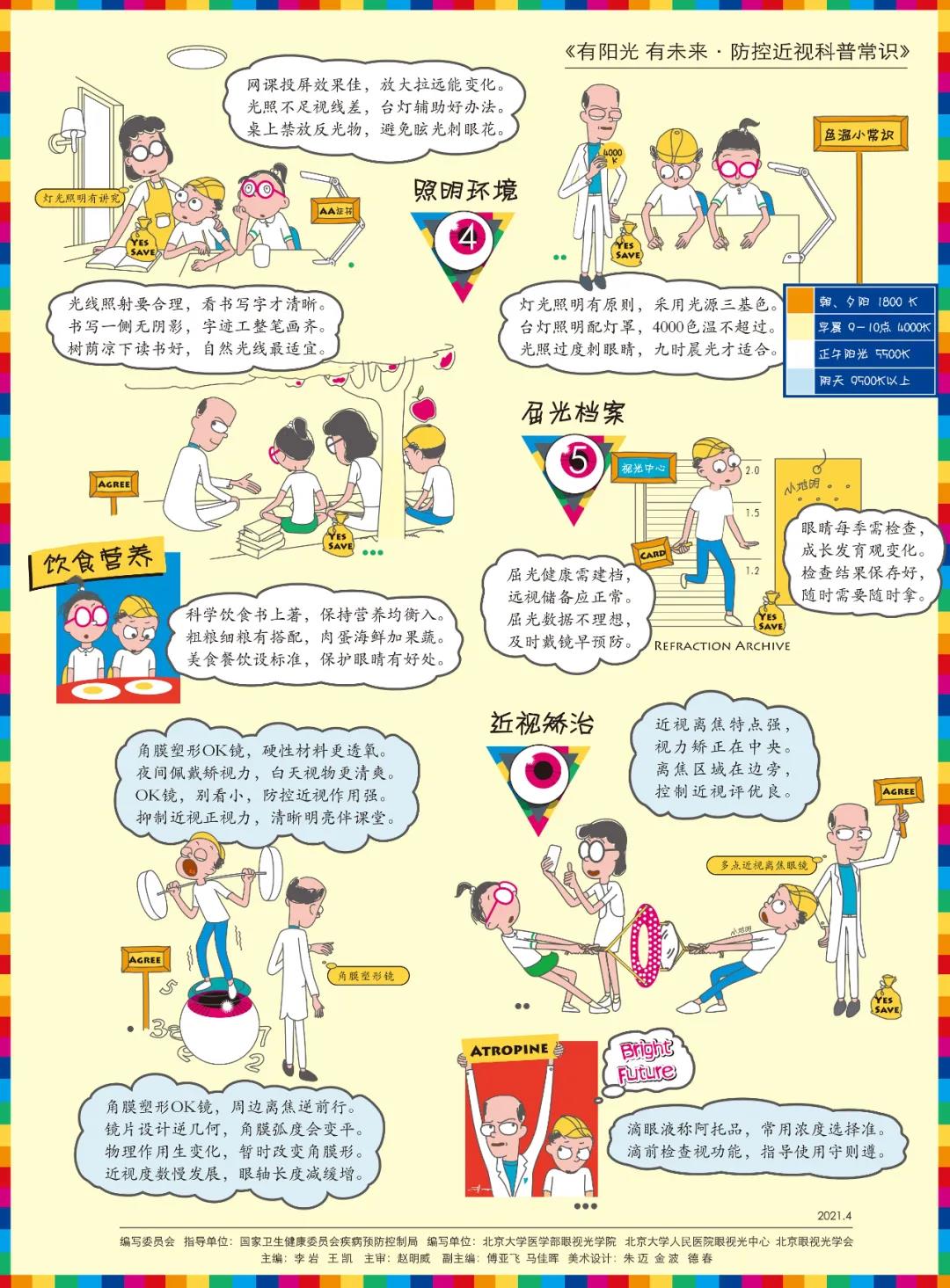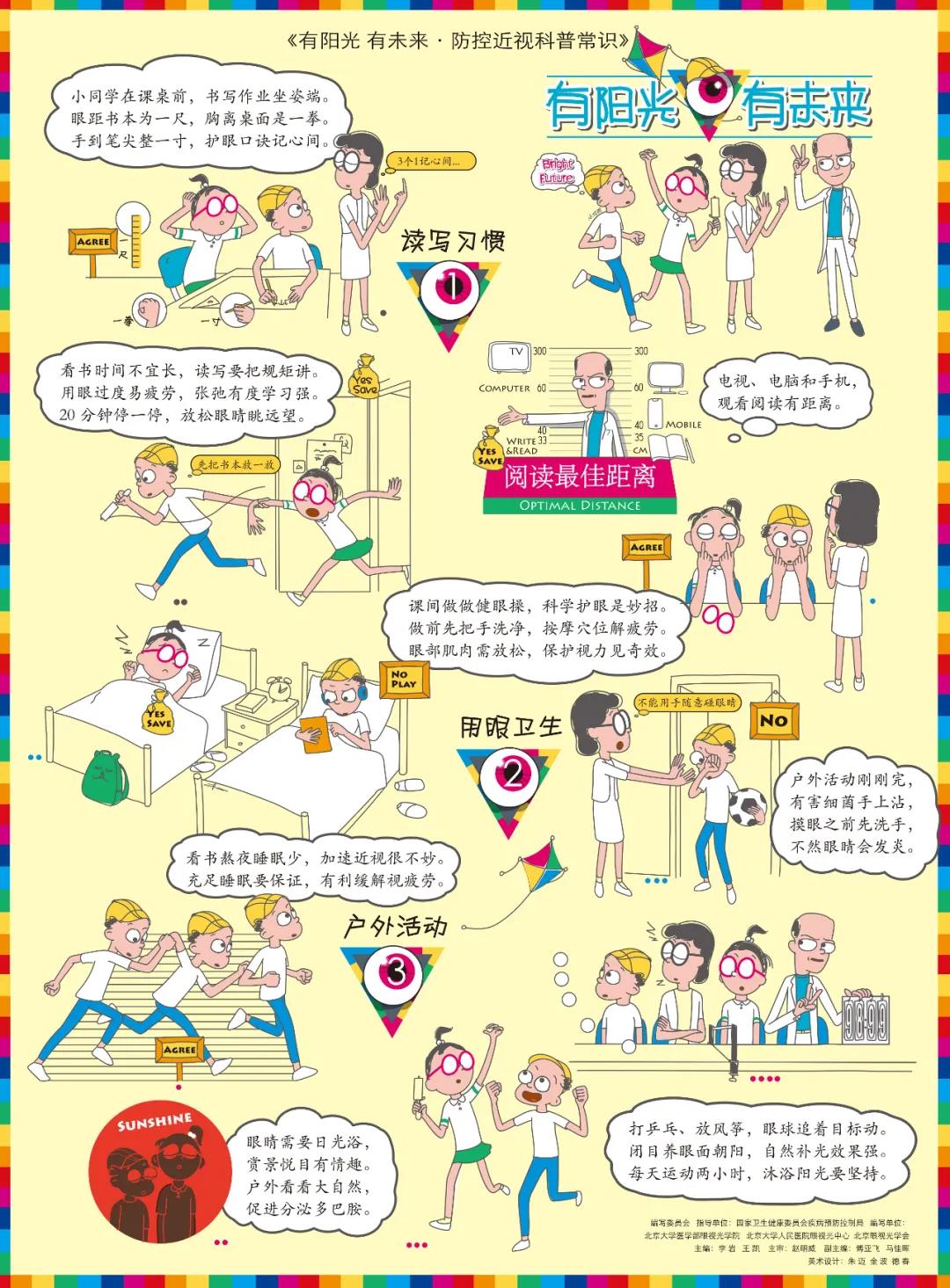 為進一步體現“健康第一責任人”理念,讓每個兒童青少年成為自己健康的主人,全面提升近視防控常識,疾控局在前期相關技術指南基礎上,委托北京大學人民醫(yī)院眼視光中心、北京大學醫(yī)學部眼視光學院等單位進行精心策劃編輯,對兒童青少年近視防控適宜技術進行了科普化應用轉化,形成了《有陽光有未來·防控近視科普常識》。旨在通過圖文并茂、通俗易懂的形式,簡單生動的向學生、家長及教師等方方面面宣傳傳授近視防控常識,動員孩子們從自身做起,形成良好的愛眼護眼行為,持久堅持下去。漫畫詳情查看