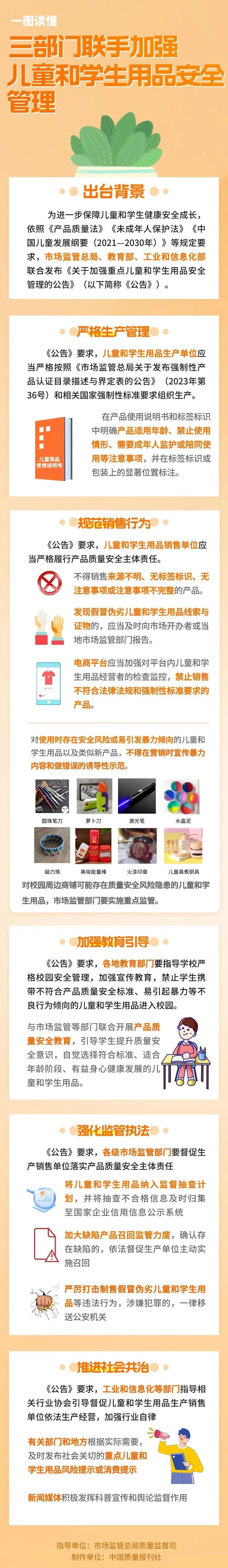 日前,市場(chǎng)監(jiān)管總局、教育部、工業(yè)和信息化部聯(lián)合發(fā)布《關(guān)于加強(qiáng)重點(diǎn)兒童和學(xué)生用品安全管理的公告》,禁止學(xué)生攜帶不符合產(chǎn)品質(zhì)量安全標(biāo)準(zhǔn)、易引起暴力等不良行為傾向的兒童和學(xué)生用品進(jìn)入校園。一圖讀懂——
