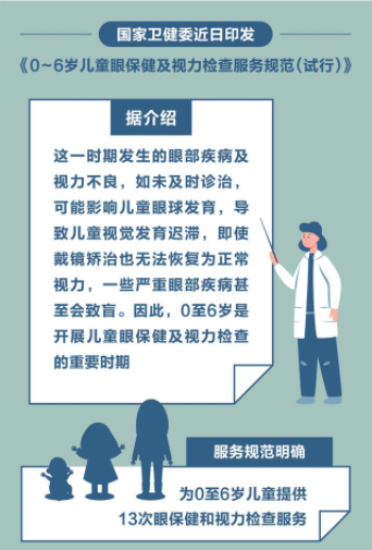 國家衛(wèi)健委此前印發(fā)《0~6歲兒童眼保健及視力檢查服務規(guī)范(試行)》,其中明確,為0至6歲兒童提供13次眼保健和視力檢查服務。